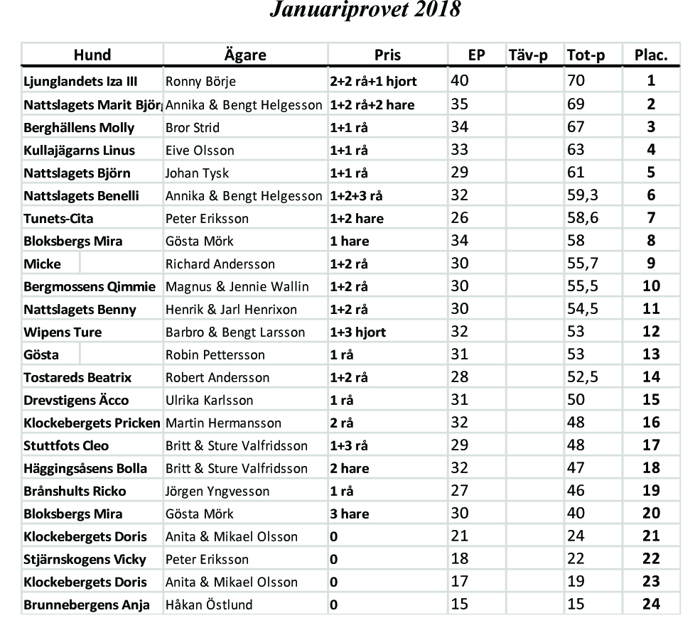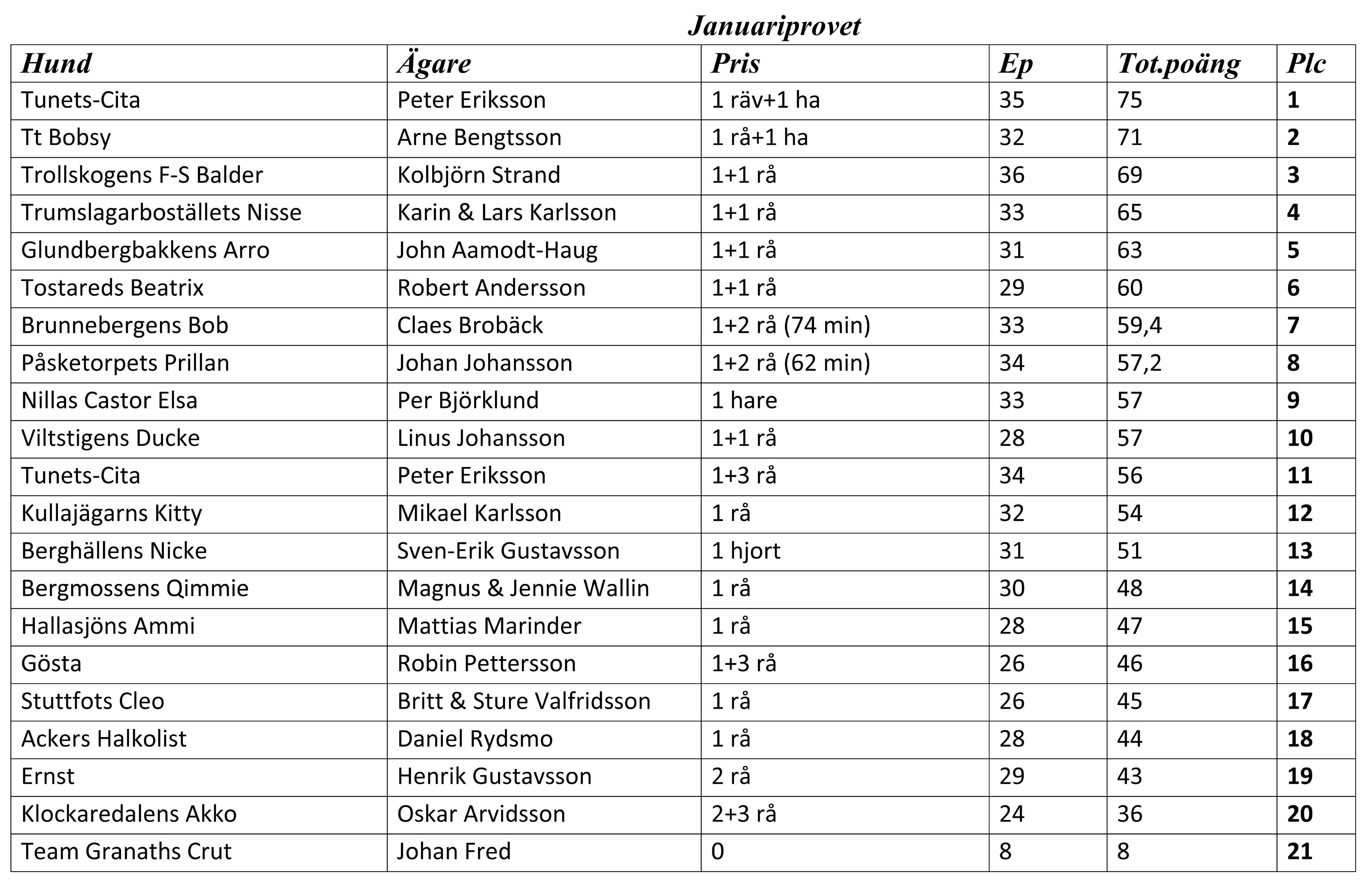 16/01. Domare: Robert Andersson. S 1: släpps i grovskog får efter kort sök slag som leder till snabbt upptag. Bra buktande drev i två repriser till full tid. kopplas på löpan. Rådjur avspårat. S 2: släpps i ny terräng efter förflyttning. Upptag på rådjur som ses strax efter upptaget samt ytterligare en gång under drevet. Bra buktande drev till full tid ej noterbara tappter förekommer. Efter full tid korsar rådjuret en bredare bäck/liten å. Hunden bryter förtjänstfullt och tar sin löpa tillbaka. Strax innan hunden når husse tar han upp på nytt. kopplas på löpan o provet avslutas. Rå 101(24), Rå 94