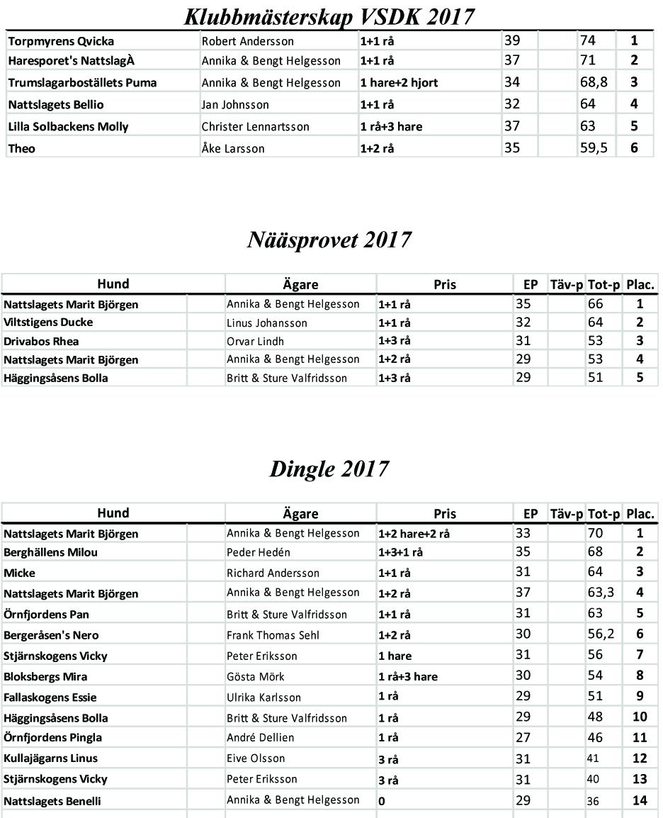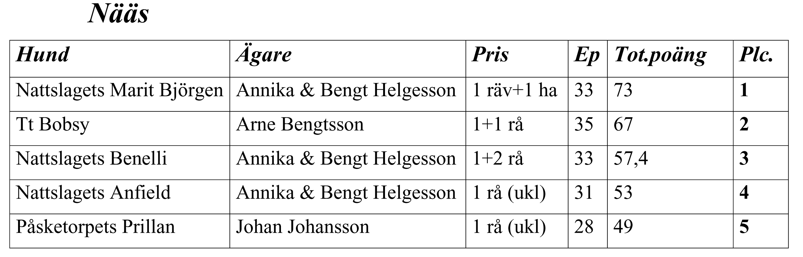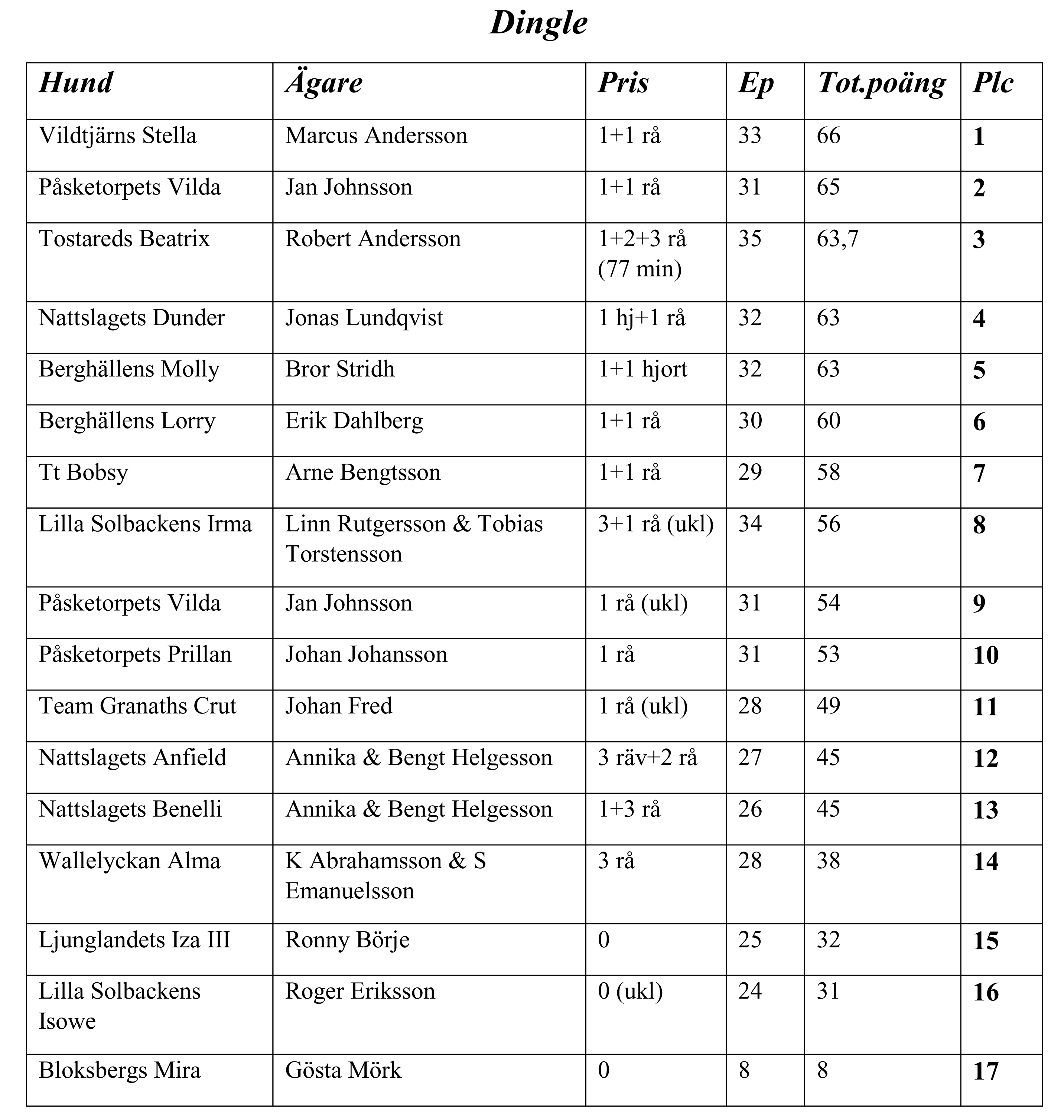 16/11. Domare: Mikael Stenqvist. S1: Söker ut och finner slag, reser rå som buktar i normala bukter till full tid. Med två noterbara tappter där sista delen av drevet går i mycket besvärlig terräng. S2: Släpps i nytt område och söker ut bra, hittar slag som resulterar i upptag på rå. Buktar mycket trångt till full tid utan noterbara tappter. Rå synligt efter 80 minuter. En hane som är otroligt rolig att lyssna på då han skallar upp i mot 180 skall i minuten. En fantastisk trevlig dag i skogen. Rå 108(36), Rå 91