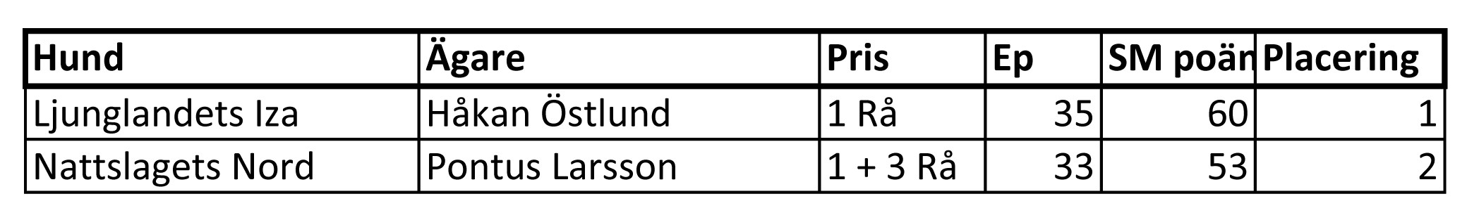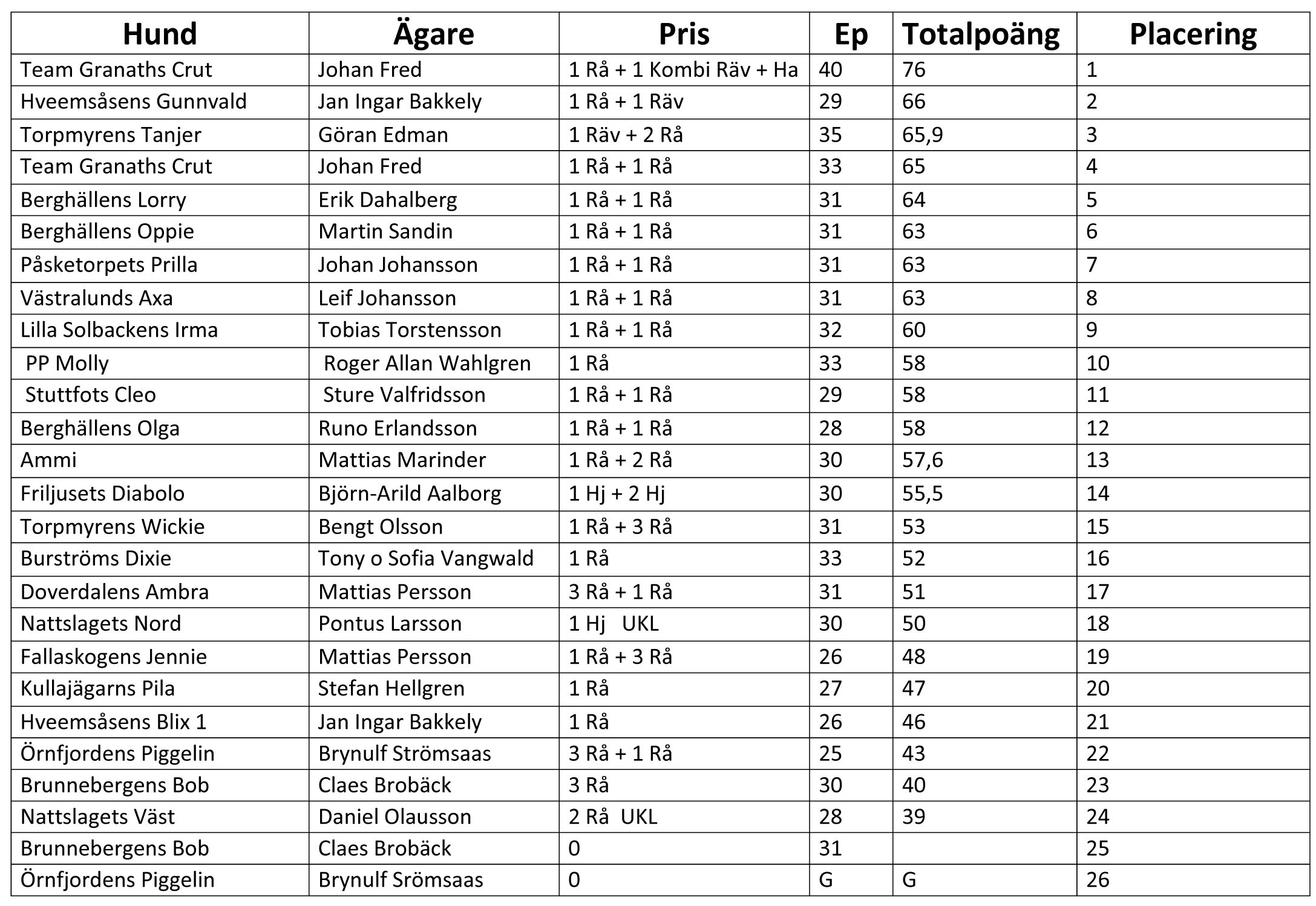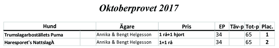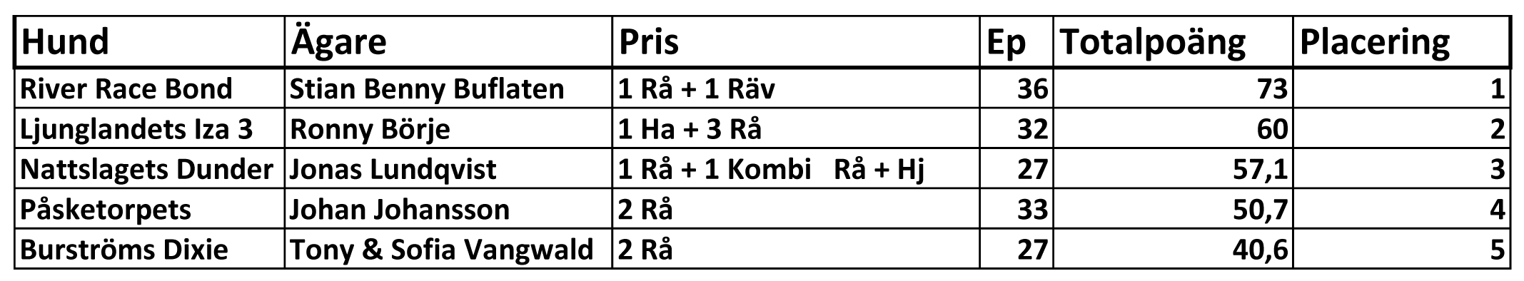 28/10. Domare: Johan Johnsson. S:1 Släpps i blandad terräng med både åkermark och skog. Drar direkt ut på en längre sök runda. Kommer tillbaka till hundföraren och skickas ut på en ny sökrunda där hunden får slag på rådjur, reser rådjur och drevet buktar i normala bukter med enstaka noterbara tappter. Drevdjuret ses 4 gånger under drevet. Hunden kallas in efter fulltid på fullt drev. S:2 gör en mindre sökrunda men kommer tillbaka till hundföraren. Hundföraren väljer att gå en runda med hunden som inte resulterar i några slag. S:3 Får omgående slag på åkermark, reser rå efter kortare slagarbete och driver det till fulltid med en noterbar tappt. Efter drevet har hunden en egen återgång till hundföraren. En trevlig unghund med utmärkt mentalitet och ett fint samspel med sin hundföraren. En lovande unghund som fortfarande är något ungdomlig i sitt drevsett när det kommer till tapptarbetet och slagarbete. Men som har bra potential när han lär sig ringa vid tappt och mer systematisk vid slagarbetet. Rå 104(26), Rå 92(11)