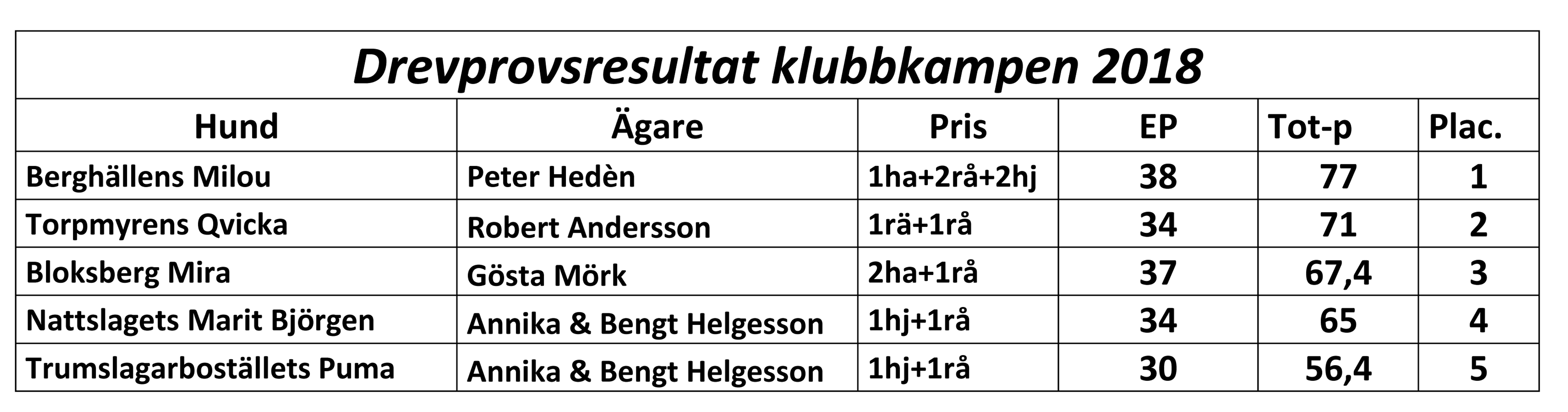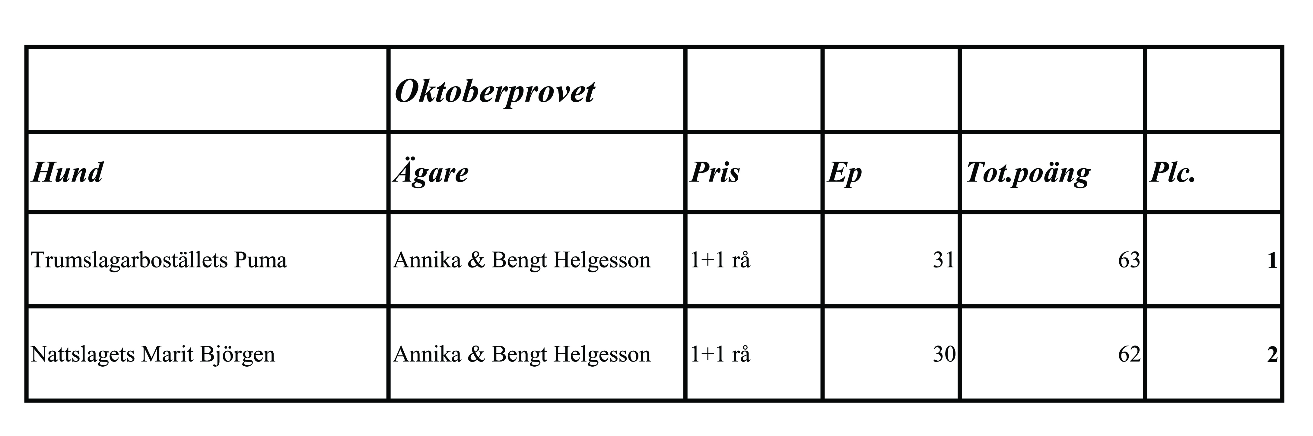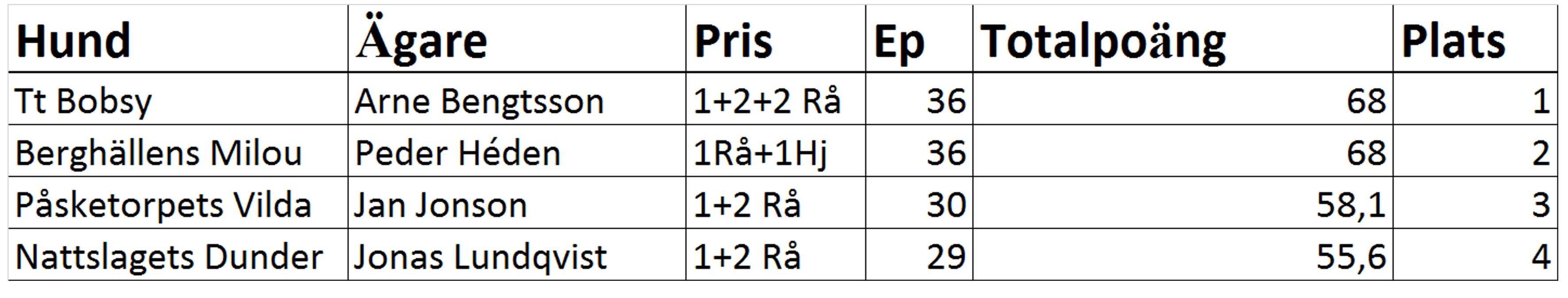 28/10. Domare: Johan Johnsson. S:1 Släpps i blandad terräng med både åkermark och skog. Drar direkt ut på en längre sök runda. Kommer tillbaka till hundföraren och skickas ut på en ny sökrunda där hunden får slag på rådjur, reser rådjur och drevet buktar i normala bukter med enstaka noterbara tappter. Drevdjuret ses 4 gånger under drevet. Hunden kallas in efter fulltid på fullt drev. S:2 gör en mindre sökrunda men kommer tillbaka till hundföraren. Hundföraren väljer att gå en runda med hunden som inte resulterar i några slag. S:3 Får omgående slag på åkermark, reser rå efter kortare slagarbete och driver det till fulltid med en noterbar tappt. Efter drevet har hunden en egen återgång till hundföraren. En trevlig unghund med utmärkt mentalitet och ett fint samspel med sin hundföraren. En lovande unghund som fortfarande är något ungdomlig i sitt drevsett när det kommer till tapptarbetet och slagarbete. Men som har bra potential när han lär sig ringa vid tappt och mer systematisk vid slagarbetet. Rå 104(26), Rå 92(11)