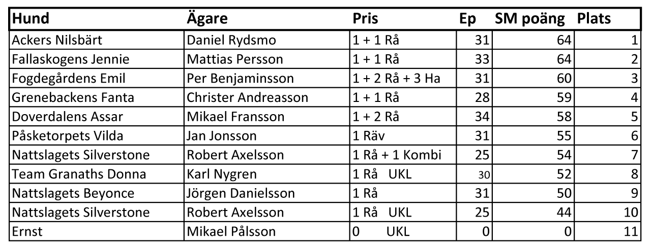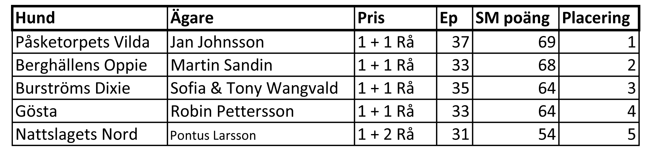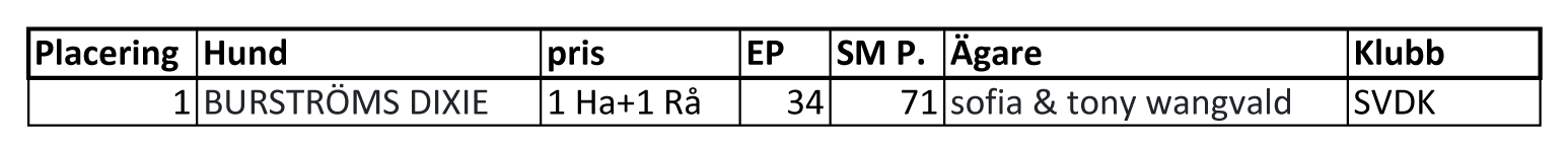 10/10. Domare: Anders Carlsson. S1. Söker i lågt tempo inom 200m, upptag på trolig hare som han tappar på en skogsväg, Hunden börjar gå tillbaka inropas på nära håll. S2. släpps där råbock varit synlig tar upp efter lite arbete, driver med några ej noterbara tappter och en noterbar, får dötappt, han börjar gå tillbaka ca 1km, men börjar där väcka men får inte ordning på drevdjuret, inropas på 200m. S3. Söker trångt och får upp hjort som ses i upptaget, kort drev som han bryter och går tillbaka. Hunden är inte i form idag, kan vara lång bilresa dagen innan som påverkar honom negativt. Okänt 2, Rå 47(13), Hj 5