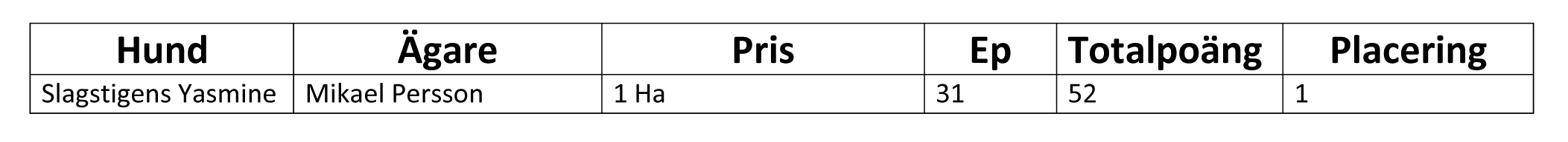 bryter och återkommer till hundförare. Provet avslutas. En mycket trevlig, samarbetsbetsvillig och lydig hund men för dagen något korta