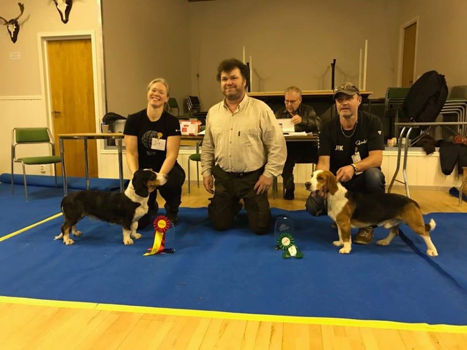 NATTSLAGETS SILVERSTONE SE25076/2019 e J SEUCH Trumslagarboställets Nisse SE56728/2015 u SEJCH SEUCH NOJ(D)CH Nattslagets Marit Björgen SE50168/2015 Äg: ROBERT AXELSSON , DingleMkh: 35 cm. Färg: Trefärgad. hane av mkt bra storlek, robust hane av utmärkt typ, bra proportioner, kunde vara aningen längre sinkropp, ganska bra hanhundshuvud men skulle ha mer kraft, blir lite för ädel i sitt uttryck, mer utvecklad i sin underkäke, utmärkt hals,stark överlinje, mkt bra bröstkorg, markerat förbröst, mkt goda vinklar, starka ben och tassar, mkt bra rörelser från sidan, mkt finkroppshållning, parallell fram och bak Excellent, 1 kk, CK, 3 bhkl