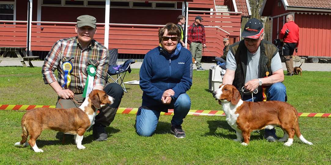 BREKKEBORGENS BENTE SE40723/2024 e J Grunnesbakkens Zanto NO46390/18 u NOBSCH Stuttfot’s I-lady NO46509/19 Äg: Robert Andersson Ida Johansson, Järpås Mkh: 30 cm. Färg: Röd & Vit. Röd med hel halsring av mkt god typ. Utm huvud, saknar en incisiv i överkäken (intyg). Aningen framskjuten skuldra. Ngt knapp markavstånd med ngt knapp bakbensvinkling. Stark bra rygg, utm päls, bra benstomme, rör sig ngt stelt bak. Very good, 4 kk